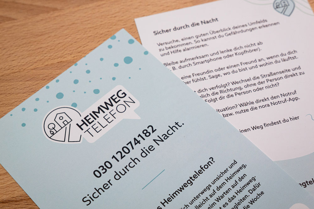 Mit dem Kauf dieses Unterstützungspakets erhältst du Flyer mit Informationen zum Angebot des Heimwegtelefons. Du kannst die Flyer beliebig unter Freunden und Familie verteilen.