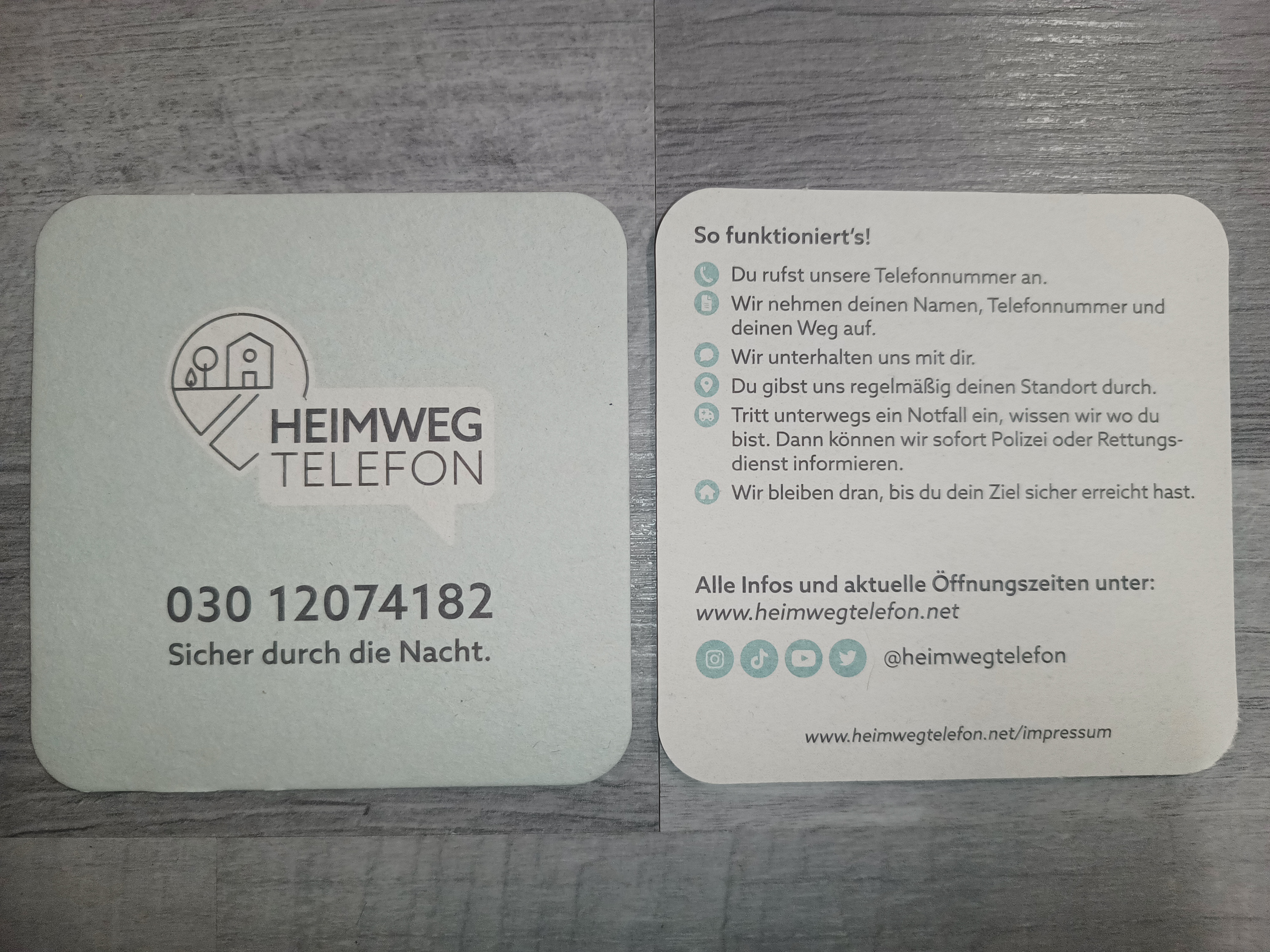 Mit dem Kauf dieses Unterstützungspakets erhältst du Getränkeuntersetzer mit Informationen zum Angebot des Heimwegtelefons. Du kannst die Getränkeuntersetzer beliebig unter Freunden und Familie verteilen.