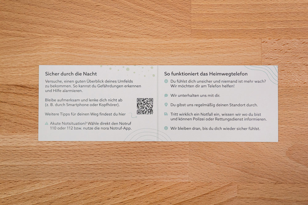 Mit dem Kauf dieses Unterstützungspakets erhältst du Visitenkarten mit Informationen zum Angebot des Heimwegtelefons. Du kannst die Visitenkarten beliebig unter Freunden und Familie verteilen.